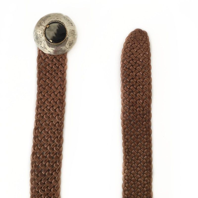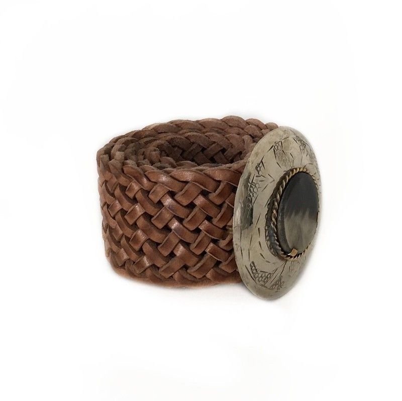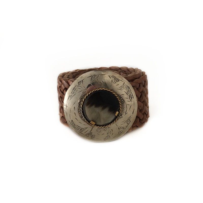 Cintura in pelle intrecciata con fibbia tonda in ottone incisa. Il colore della fibbia è unico, per via della lavorazione artigianale e del materiale di fabbricazione, essendo variabile anche il colore della pietra o del materiale centrale della fibbia, così come la sua intreccio. Può essere indossato in vita e sui fianchi. Cintura ideale da abbinare a look dall'aria bohémien. Proposta di questo bellissimo disegno con tessuto fatto a mano e fibbia decorativa in osso con finitura in metallo color argento. Collezione ispirata allo stile boho chic e hippie con un tocco bohémien per i tuoi abiti ibizenchi, ideali per abbigliamento casual o da ufficio. Disponibile in varie dimensioni, colori e diverse forme di fibbia.